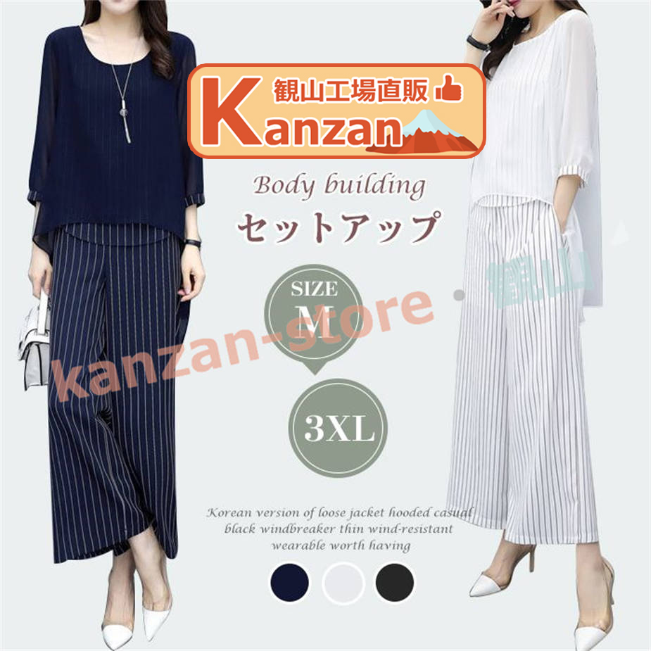 セットアップ レディース パンツドレス パンツスーツ シフォン 袖あり 春夏 ストライプ 女の子 結婚式 二次会 卒業式 卒園式 ガウチョパンツ 【一部当日発送】