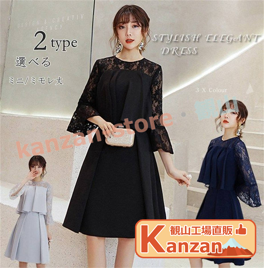パーティードレス ドレス 二次会 結婚式 ワンピース ミディ 膝上ドレス レース切替 フレア袖 ワンピース チョーカー 袖有り 同窓会 紺