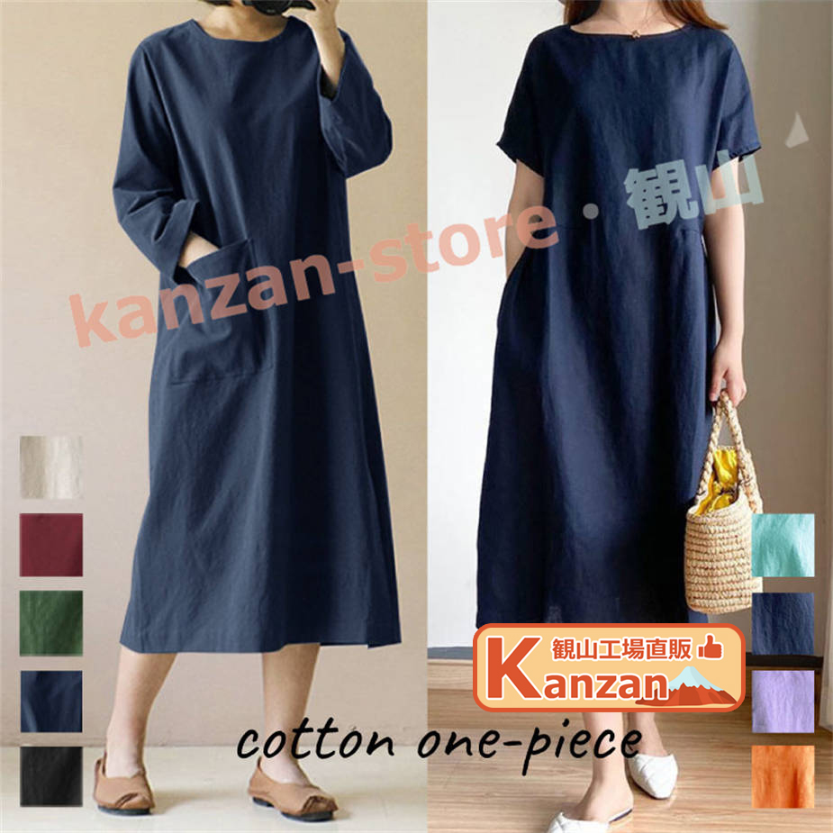 選べる2パターン 半袖 長袖 コットン リネン混 ワンピース 麻 綿 綿麻 レディース ミモレ丈 コットン ゆったり リラックス ナチュラル ドレス