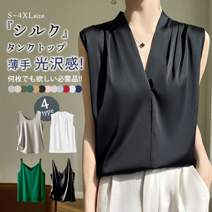 シルク タンクトップ 4タイプ レディース Vネック キャミソール 大きいサイズ インナー Uネック トップス ノースリーブ シャツブラウス 【一部当日発送】