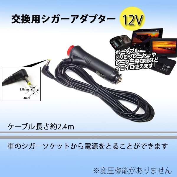 | 商品タイトル | 【定形外送料無料】スイッチ付きシガーアダプター シガーライター 12V コネクター 外径4mm 内径1.8mm ポータブルDVDプレーヤー レーダー探知機 |
