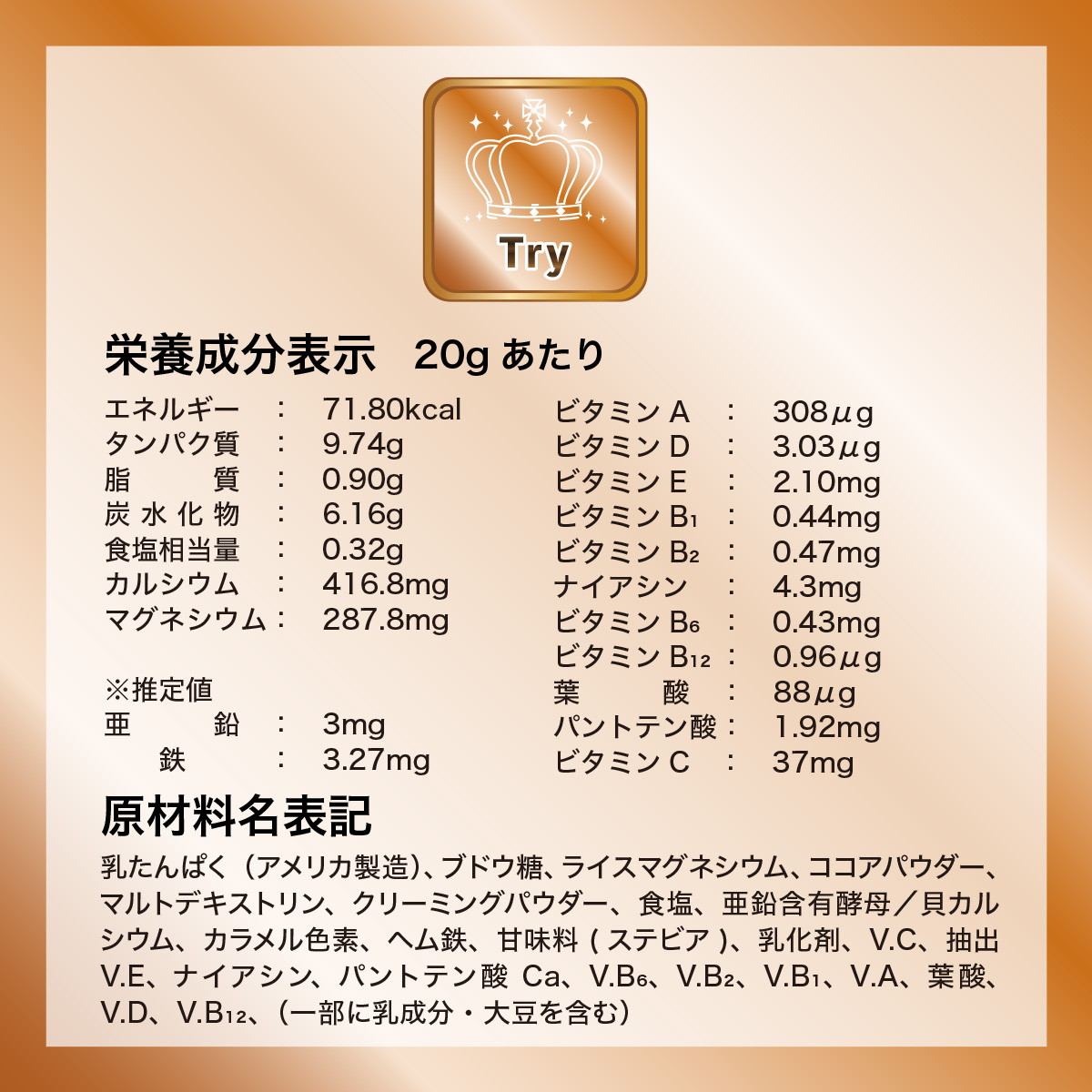| 乳たんぱく(アメリカ製造)、ブドウ糖、ライスマグネシウム、ココアパウダー、マルトデキストリン、クリーミングパウダー、食塩、亜鉛含有酵母/貝カルシウム、カラメル色素、ヘム鉄、甘味料(ステビア)、乳化剤、V.C、抽出V.E、ナイアシン、パントテン酸Ca、V.B6、V.B2、V.B1、V.A、葉酸、V.D、V.B12、(一部に乳成分・大豆を含む) |