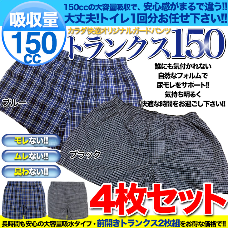 失禁パンツ 尿もれパンツ 4枚組 送料無料 当日発送 男性用 メンズ 吸収量150cc 尿漏れ対策、失禁対策に 綿100%