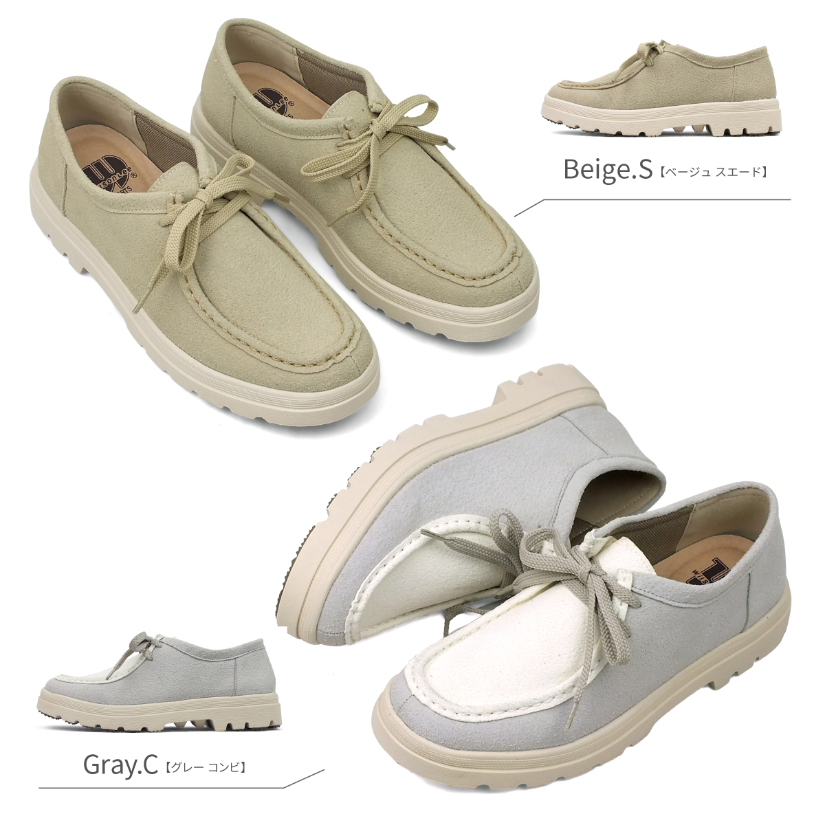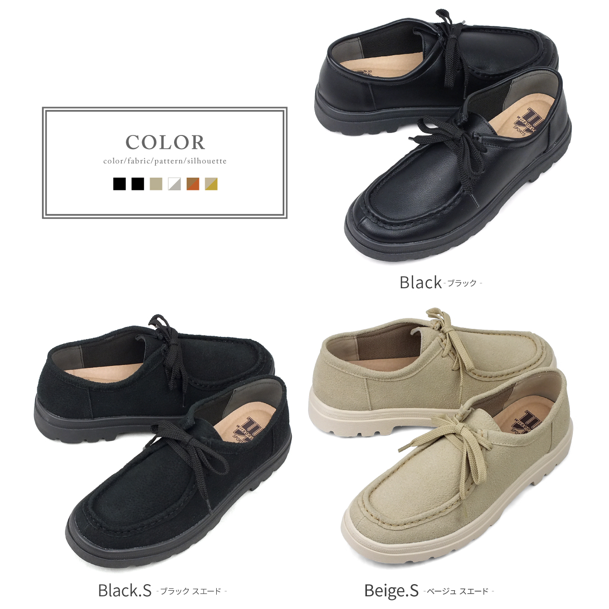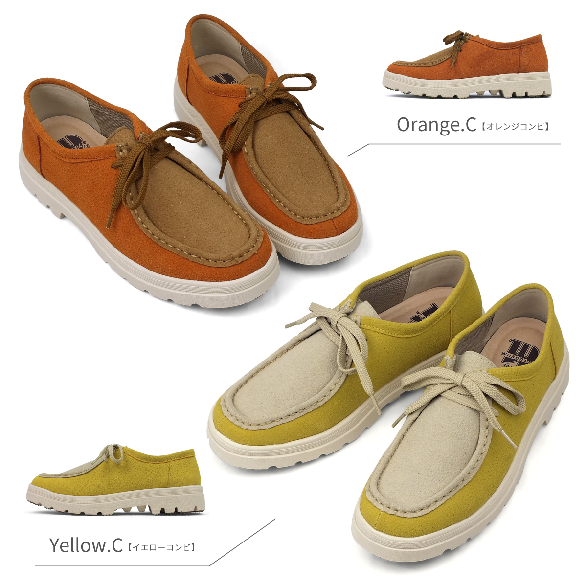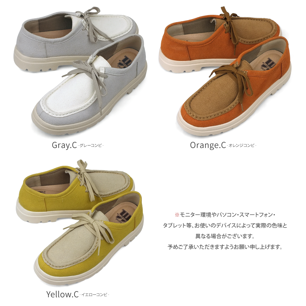 1)カラー:ブラック/ブラックスエード/ベージュスエード/グレーコンビ/オレンジコンビ/イエローコンビ