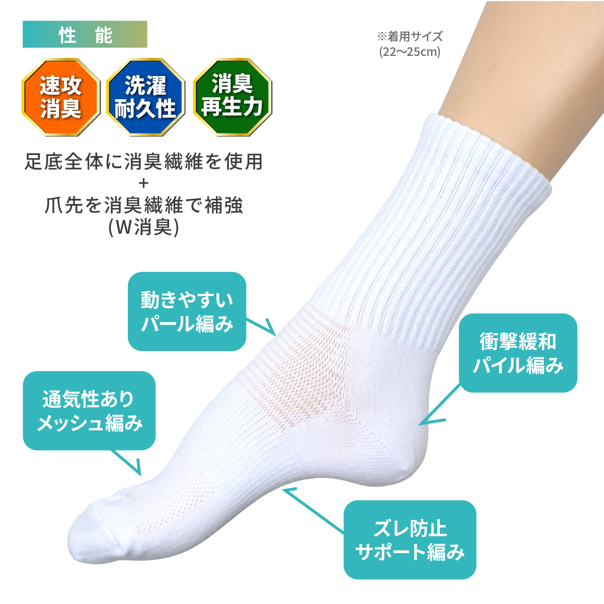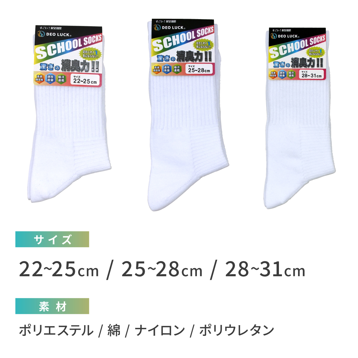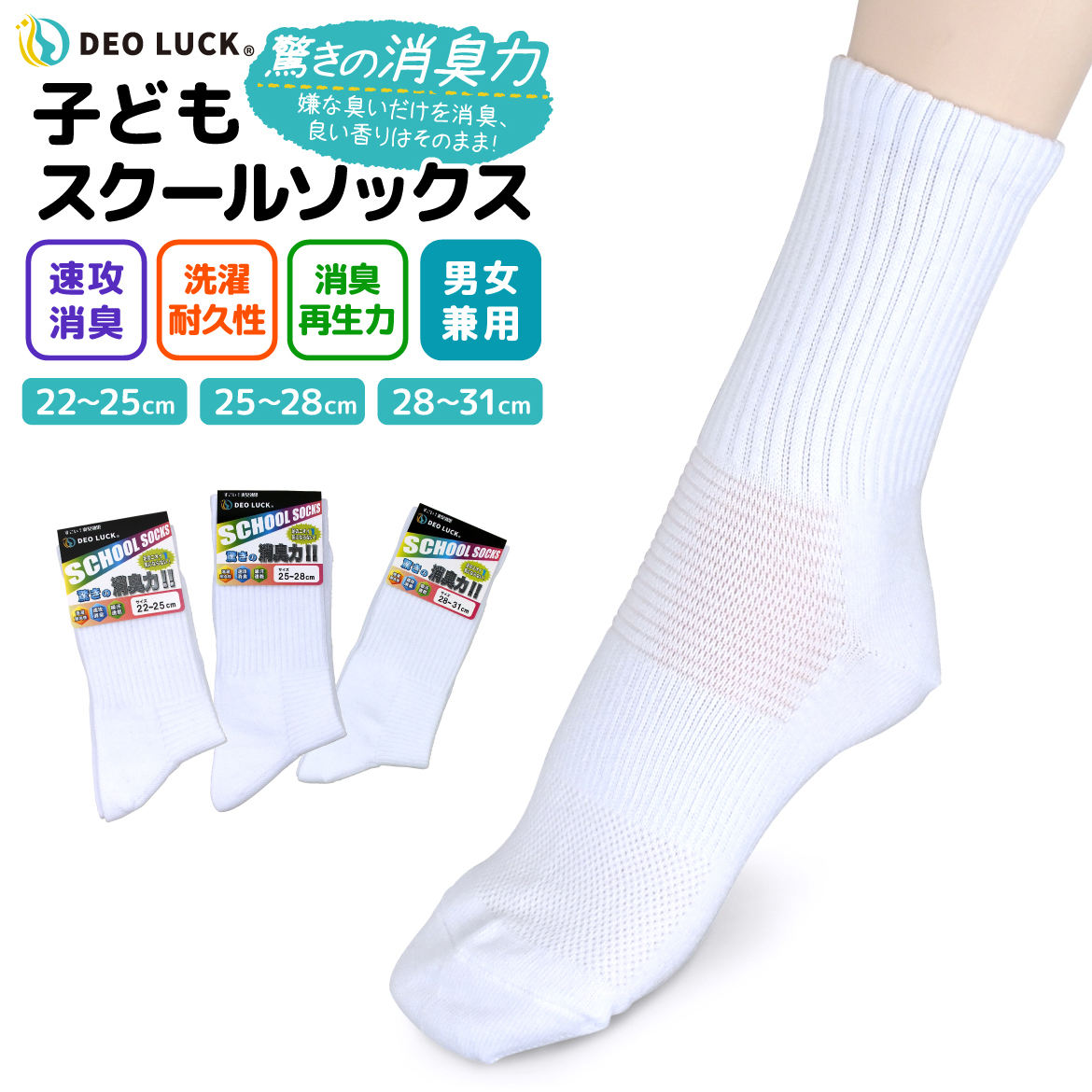 デオラック 消臭靴下 子供スクールソックス ホワイト 男女兼用 臭わない W消臭 無臭 洗濯耐久性 衝撃緩和 通気性 ズレ防止 つま先補強 かかと補強