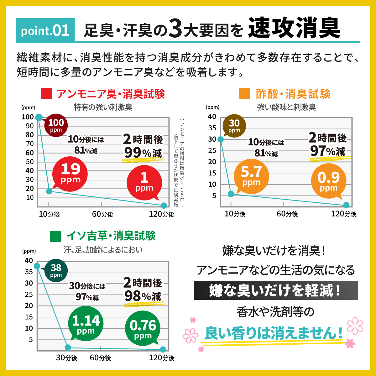 日本製の消臭繊維が、ニオイの3大臭「アンモニア」「イソ吉草酸」「酢酸」を吸着消臭。