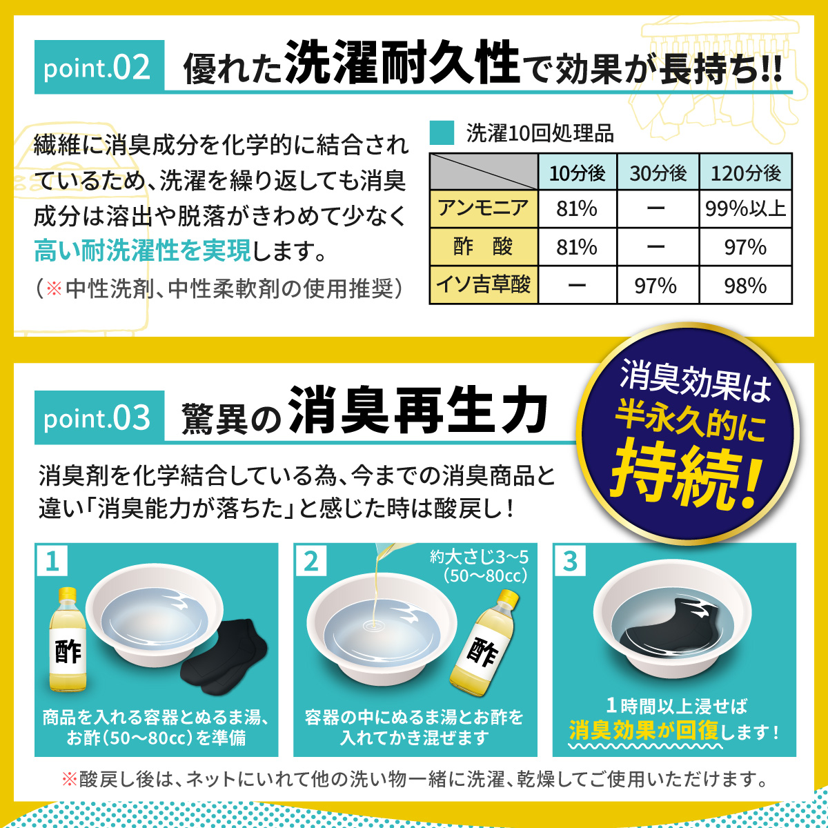 洗濯を繰り返しても消臭成分の脱落がきわめて少なく高い耐洗濯性を実現しました。