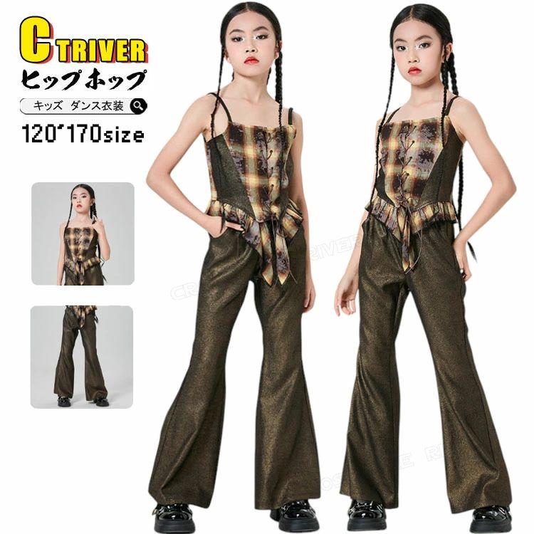 キッズダンス衣装 セットアップ k-pop 衣装 チェック柄 金属色 フレアパンツ ロング パンツ キャミソール 韓国 アイドル 衣装 カッコイイ