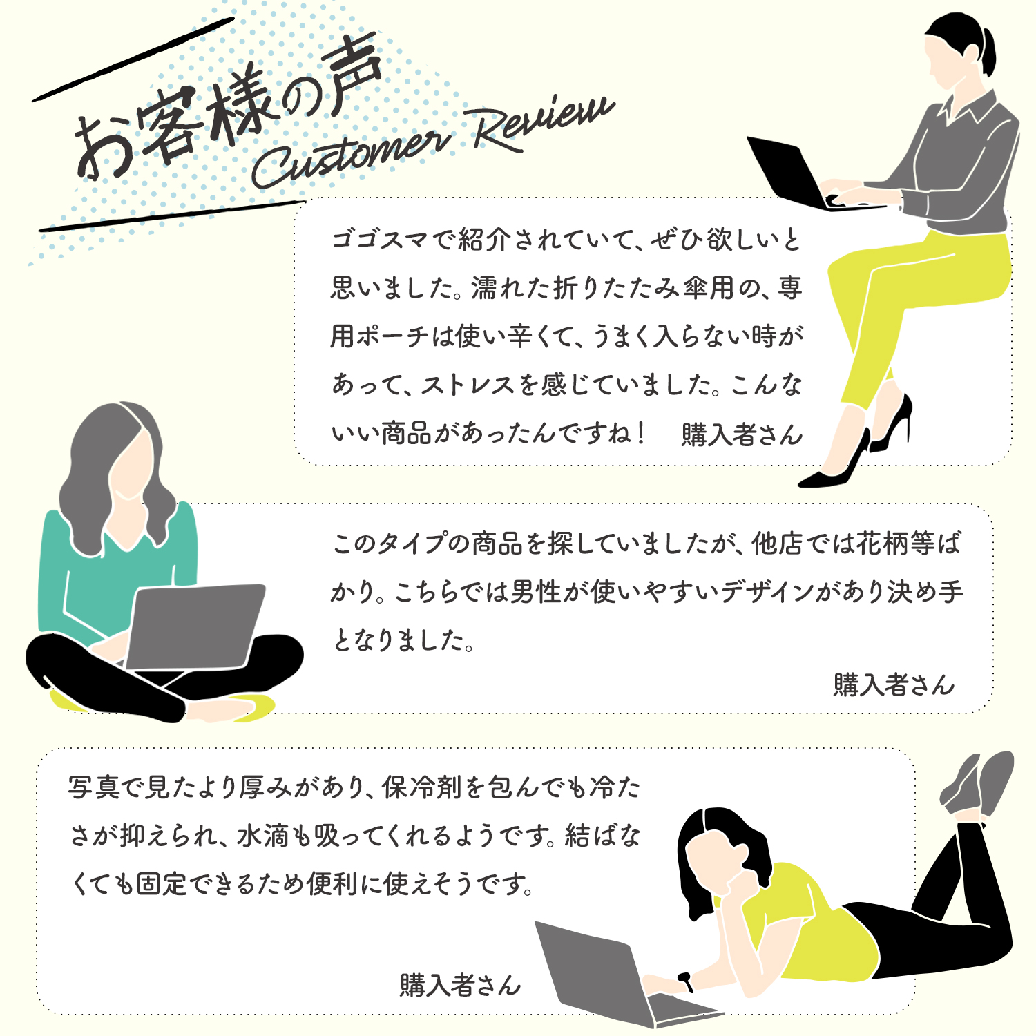 | 注意事項 | ※サイズや重さは人工計測となります為、若干の誤差が生じる場合がございます。 ※こちらの製品は洗ってご使用頂けますが、洗濯機は使用せず常温の水で手洗いし、陰干しするようにしてください。 ※傘やペットボトルなどを包む際、完全に水漏れを保証する物ではございません。染み出しにくい仕様ですが、長時間濡れた物を放置しないようにご注意ください。 ※モニターの発色の具合によって実際のものと色が異なる場合がございます。あらかじめご了承ください。 |