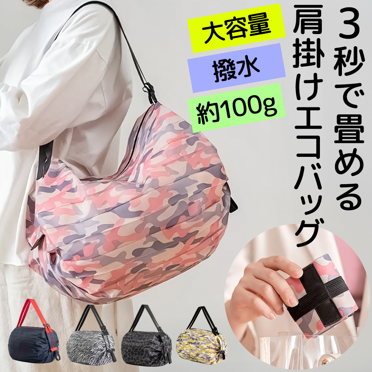 | 誰でも約3秒で畳める大容量エコバッグが登場!左右に引っ張って丸めるだけなので、結んだり折り畳んだりという手間から解放されます。収納たっぷりで軽量なので、旅行、買い物、ライブ、推し活など様々な用途にお使い頂けます。 |