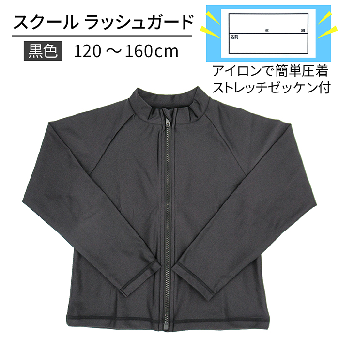 ラッシュガード 黒 キッズ スクール 小学校 長袖 フードなし ゼッケン付き 女の子 男の子 ジップアップ UVカット 日焼け防止 水泳 プール スイミング km-004