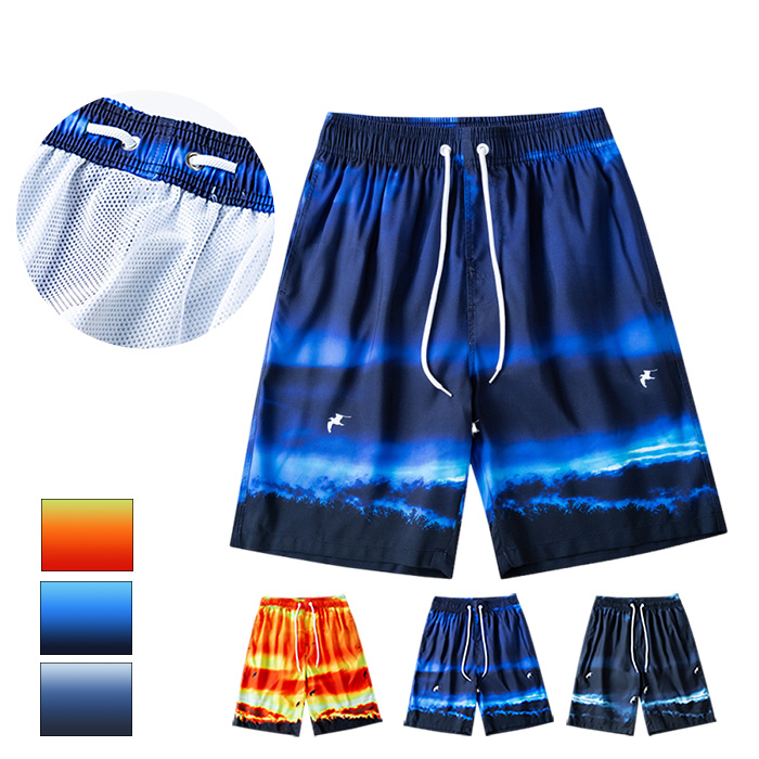 メンズ 水着 海パン スイムパンツ ハーフ丈 ウエストゴム+調整紐付き メッシュインナー ポケット付き 大人 グラデーション リゾート プール 海 夏 青 紺 mm-008