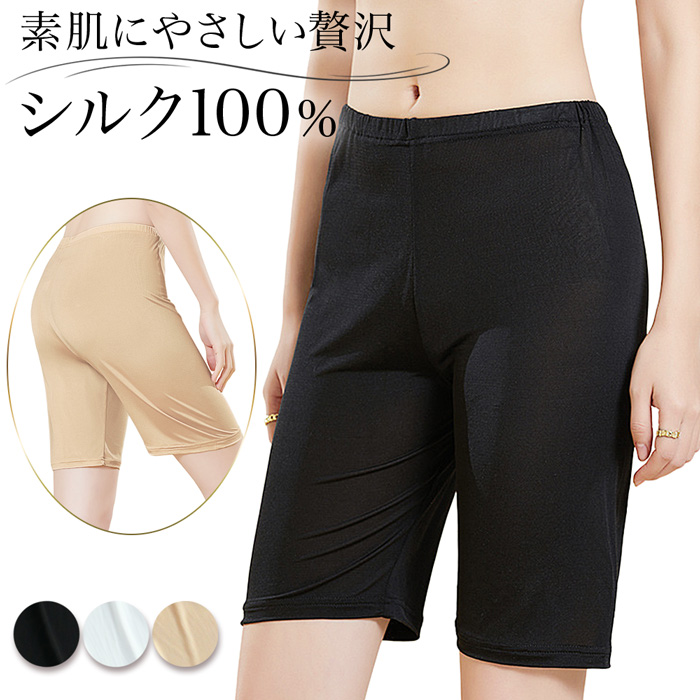 シルク100% レディース 5分丈 ペチコート インナーパンツ さらさら 肌に優しい 敏感肌 吸湿性 保温性 吸汗 ストレッチ 伸縮性 光沢 高級感 黒 白 rs-044