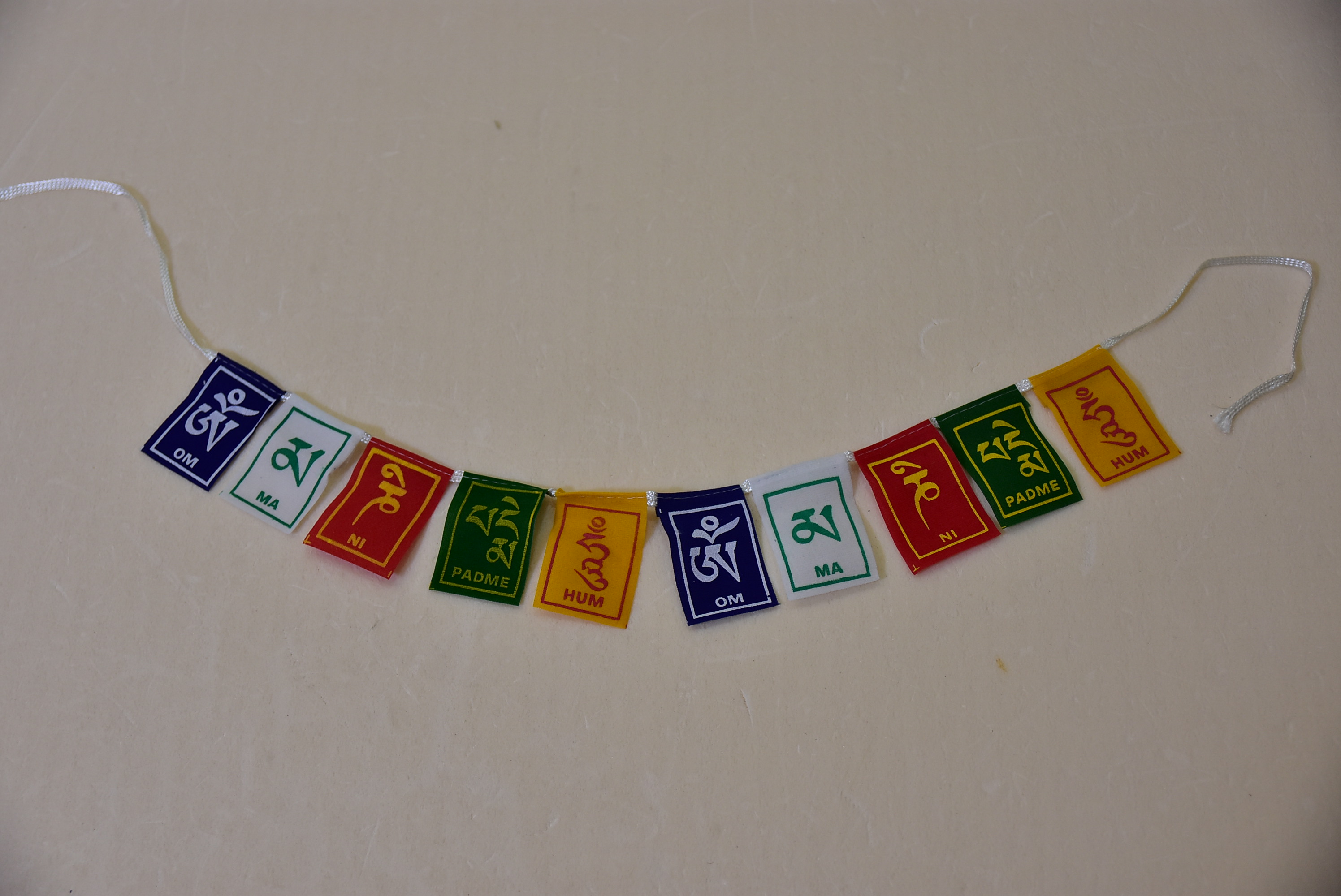仏教の真言が書かれた5色の旗が2連(合計10枚)つながった小さなタルチョです
