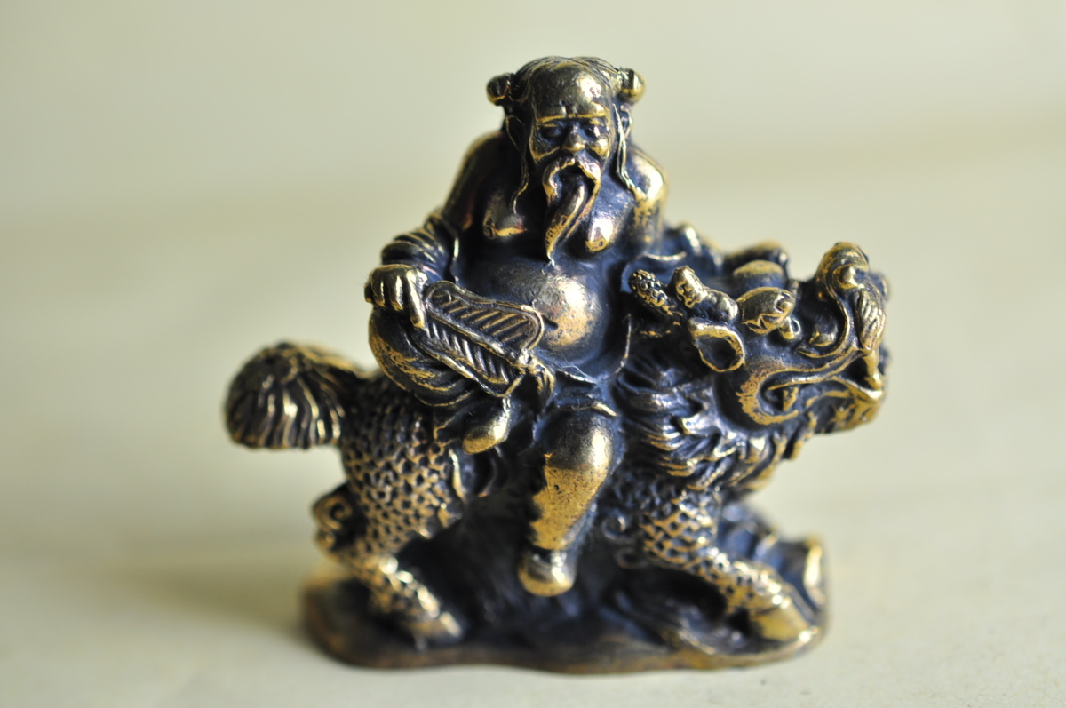 四獣の一つ、麒麟に乗った阿羅漢のメタル像です