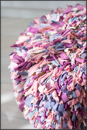 Karmieのプフは、色鮮やかに染め直したリサイクルコットンの生地をロール状のシャギーにして手作業で編み込んでつくられています。カラーは、ピンクを中心にパープルやラベンダーなど、濃淡さまざまなマルチカラー。ゴールドのラメ糸も散りばめて、カラフルなキャンディのようにポップでキュートなデザインです。