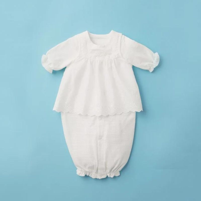 高級感のあるかわいいエプロンがついたツーウェイミニです。うまれてから半年くらいまで着用できる70cmサイズ。ちょっぴり逞しい赤ちゃんもゆったりと着られるサイズです。出産準備や出産祝いに便利なアイテムです。