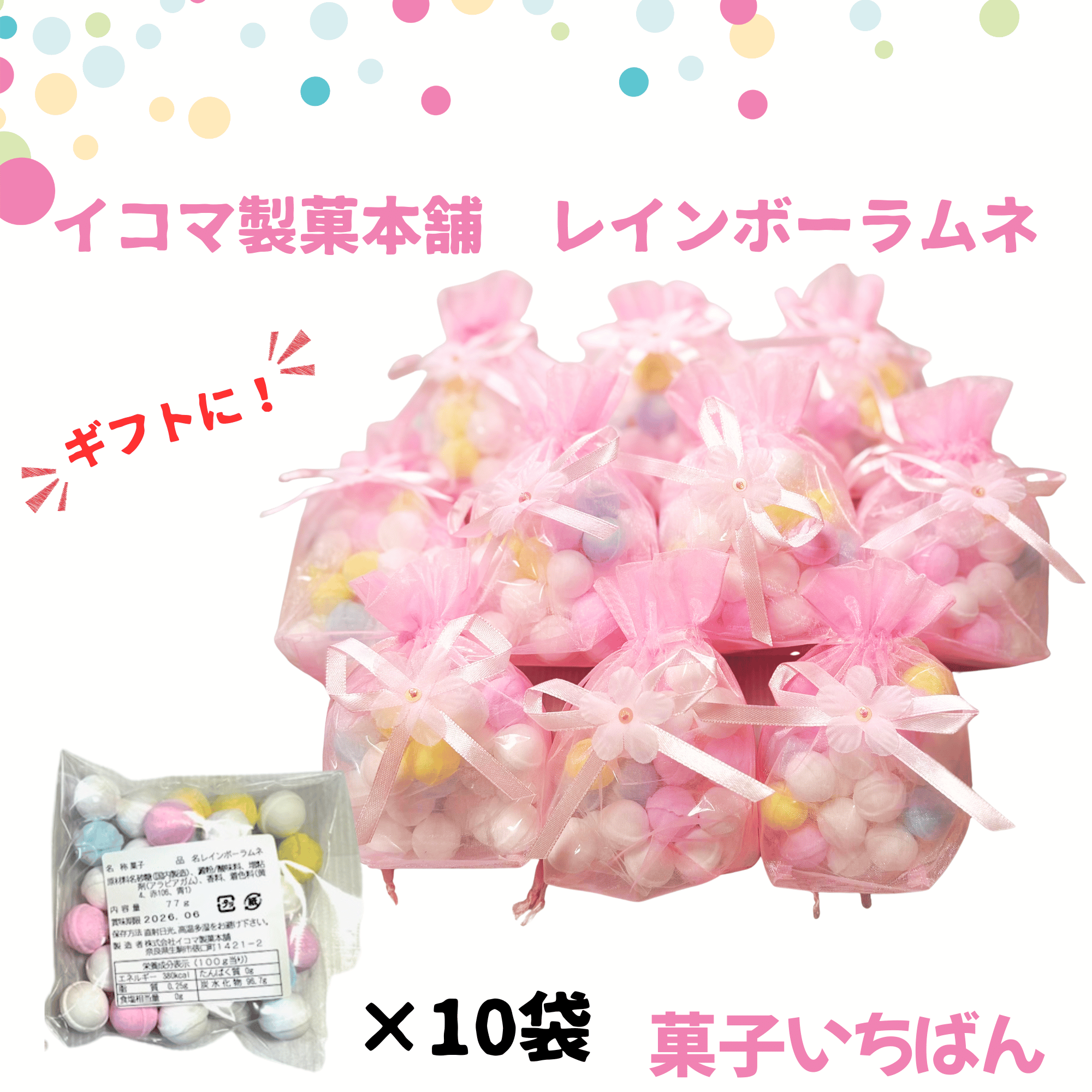 \送料込/ イコマ製菓本舗 レインボーラムネギフト 10個セット 奈良県生駒市の老舗・イコマ製菓本舗の人気商品「レインボーラムネ」を、 可愛いピンクの巾着袋に入れたギフト仕様でご用意しました。 77g入りのレインボーラムネを、ピンクの巾着袋に1つずつ包装したものが合計10個入ったセットです。 見た目も可愛く、配りやすいため、プチギフトにぴったり。 ほろっと軽く、口の中でやさしく溶ける独特の食感と、どこか懐かしい甘さが特徴。 カラフルなラムネと淡いピンクの巾着袋が、贈る側・もらう側どちらも笑顔にしてくれます。 ? 友人・職場への配り用ギフトに ? ちょっとしたお礼やプチギフトに ? 甘すぎないお菓子を選びたい方に 季節限定の特別なギフトとして、自分へのご褒美にもおすすめです。
