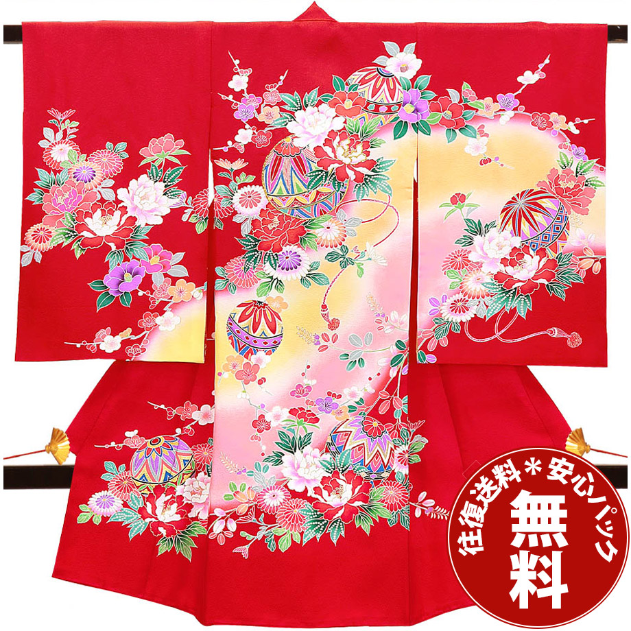 牡丹や菊などの四季折々の花々に鞠が描かれた可愛らしく、繊細な金刺繍が施された洗練された面立ちのお祝い着です。神社へのお宮参りの晴れ着や記念撮影に。