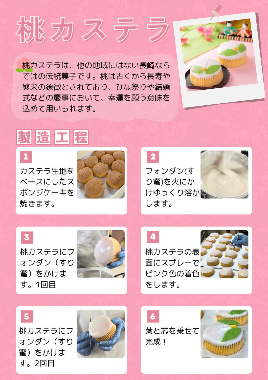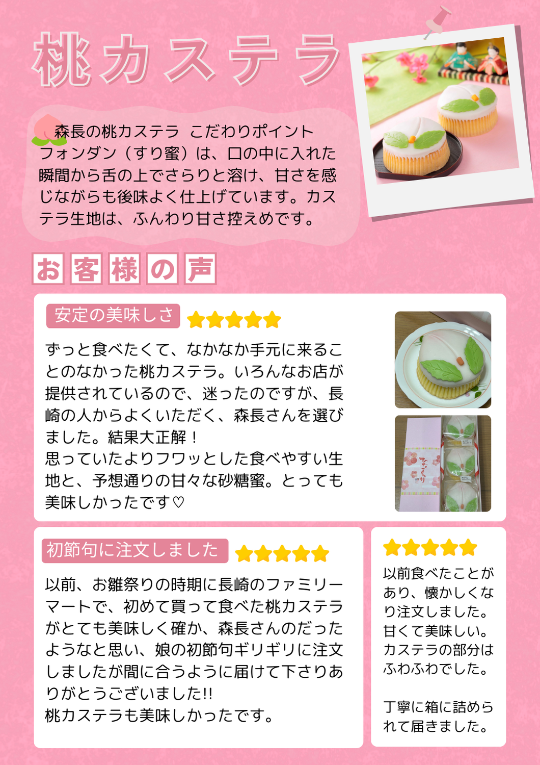 菓秀苑森長の桃カステラは、本場長崎の職人が丹精込めて一つ一つ丁寧に仕上げています。