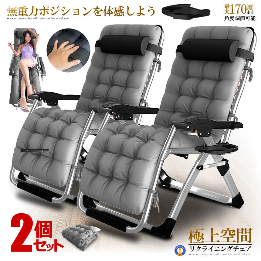 2個セット リクライニング チェア VIP型 グレー クッション 折りたたみチェア 枕つき リビング 金属ロック 角度調節 耐荷重200kg RIKUCHAI-A-GY