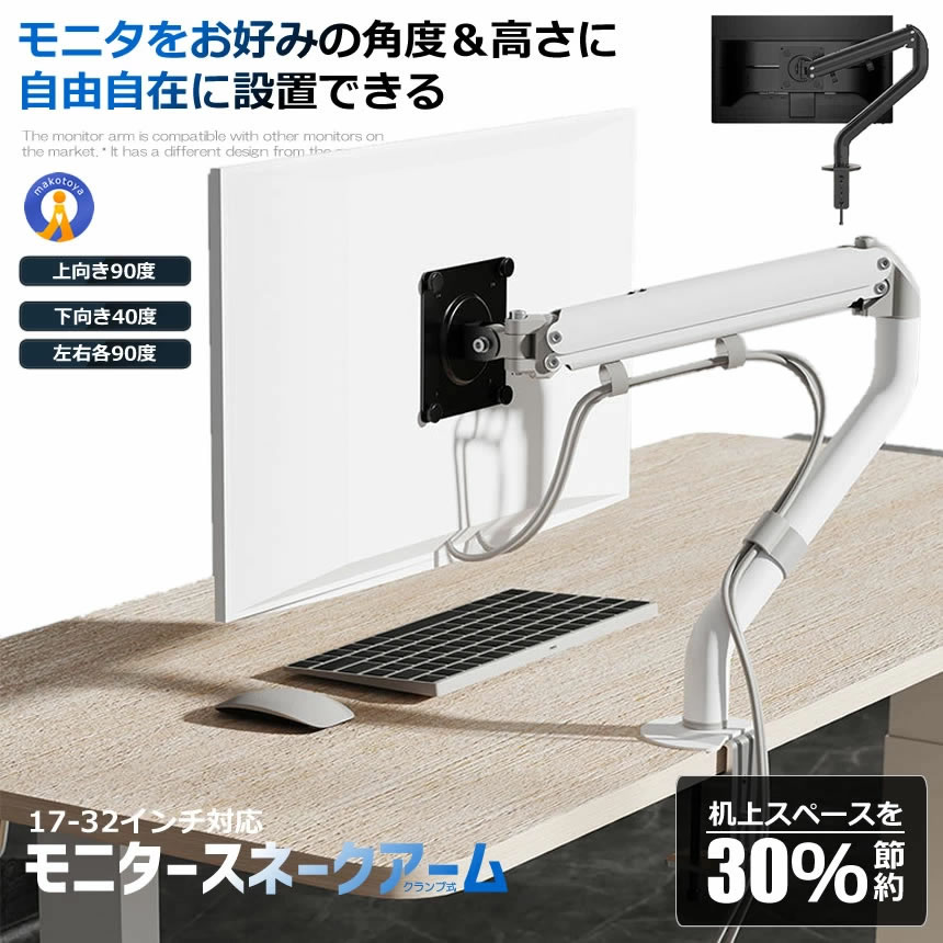 モニターアーム17-32インチ対応 ディスプレイ シングルアーム ガススプリング式 クランプ式 グロメット式 パソコン 固定設置 デスク作業時 オフィス MONITARM