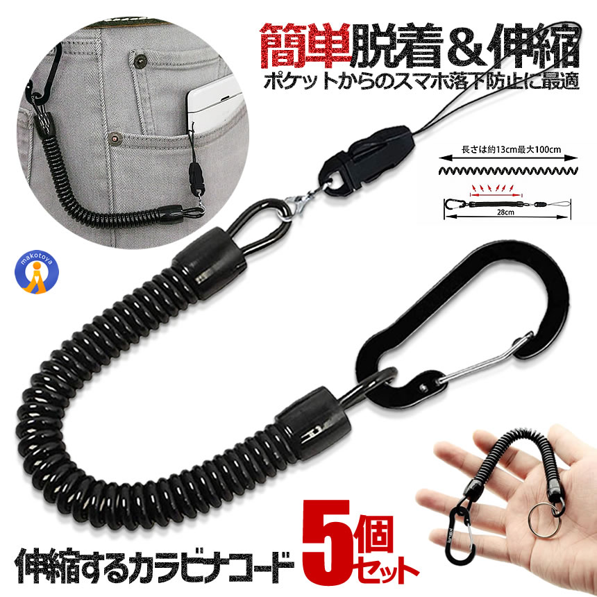 コードストラップ 5本セット コイルストラップ 伸びる 太めタイプ ロック機能付き カラビナ リング キーチェーン スマホ キーホルダー おしゃれ 伸縮 5-KAGHUE