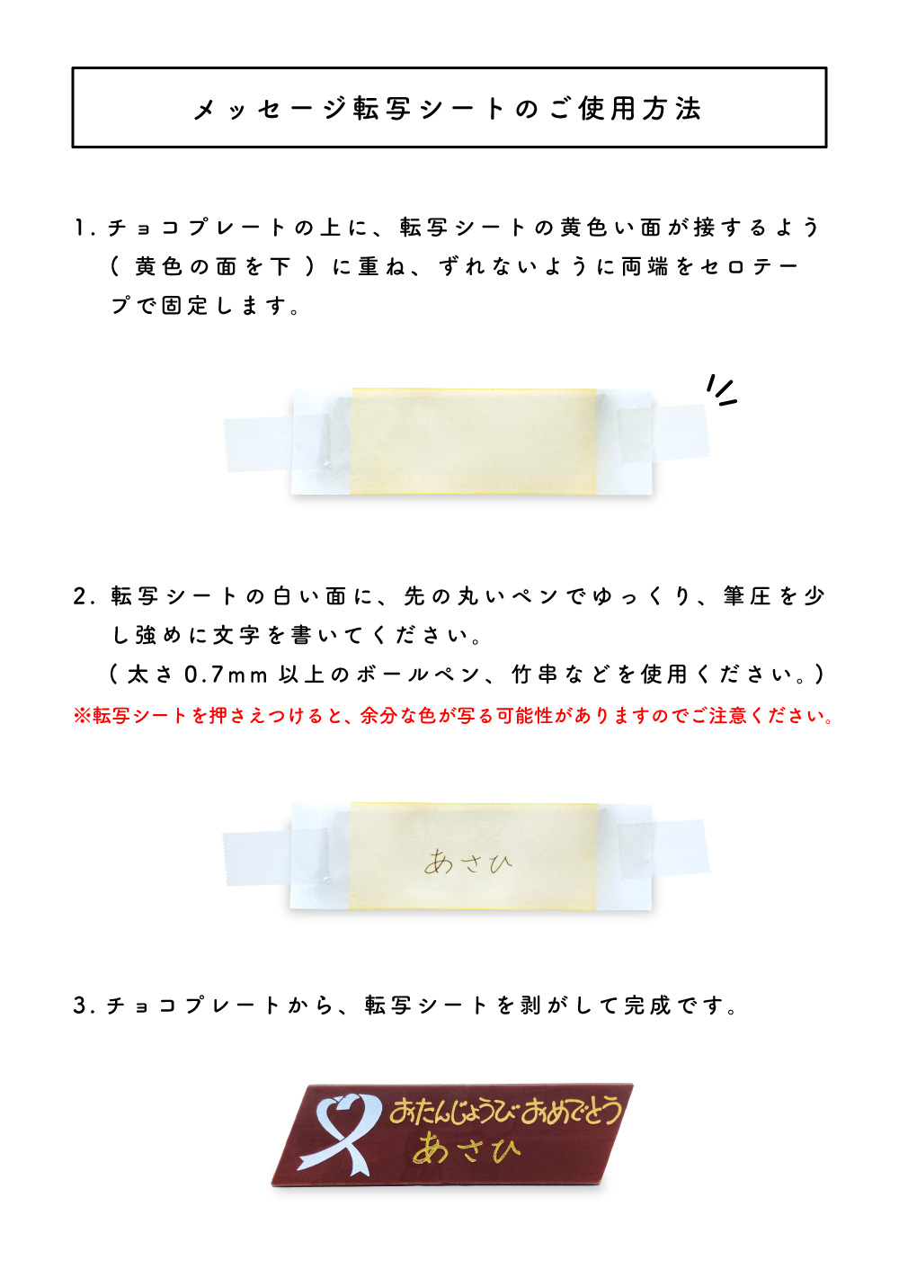 ・商品到着後、チョコプレートとメッセージ転写シートは冷蔵庫で保管してください。