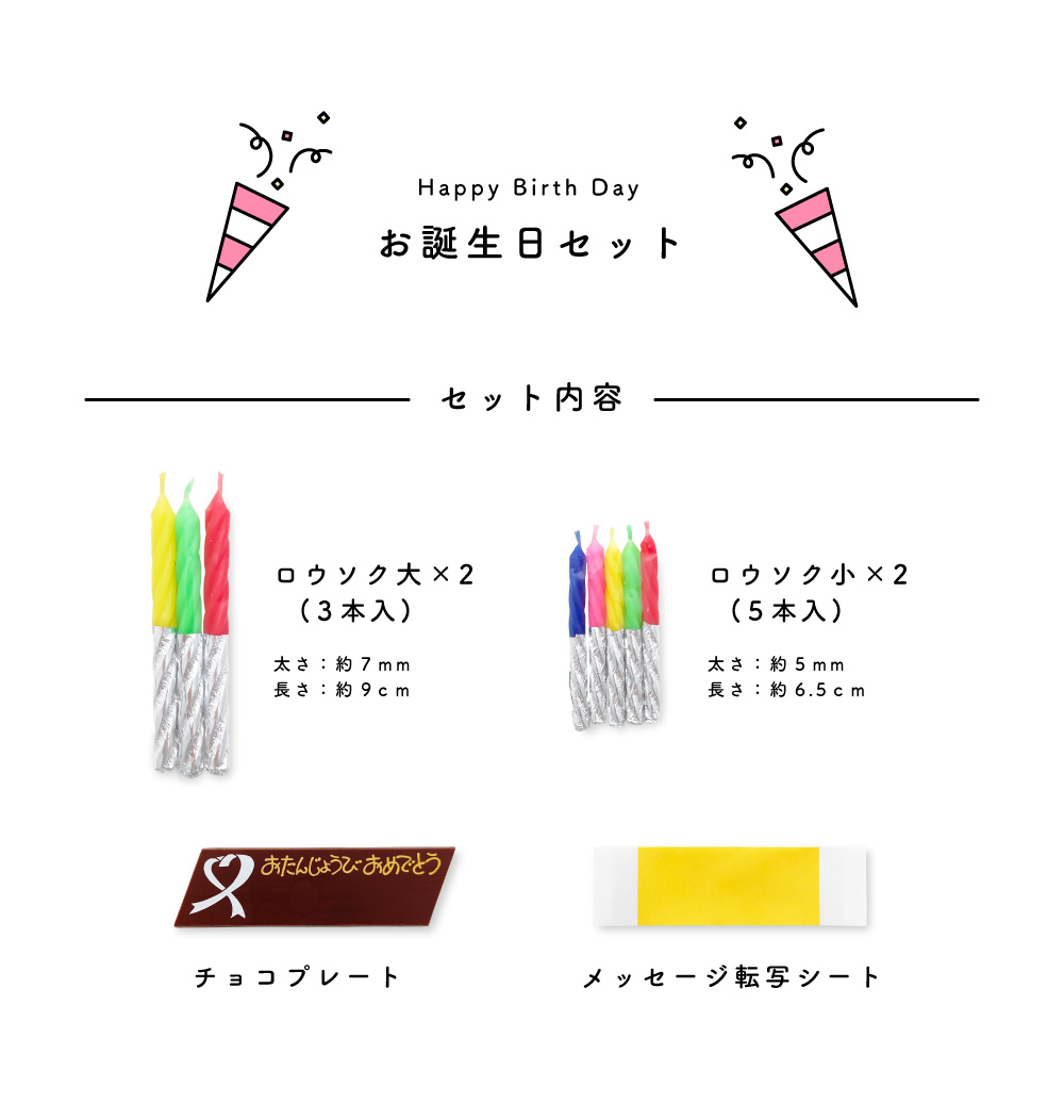 ■セット内容:ロウソク大(3本入)×2/ロウソク小(5本入)×2/チョコプレート/メッセージ転写シート
