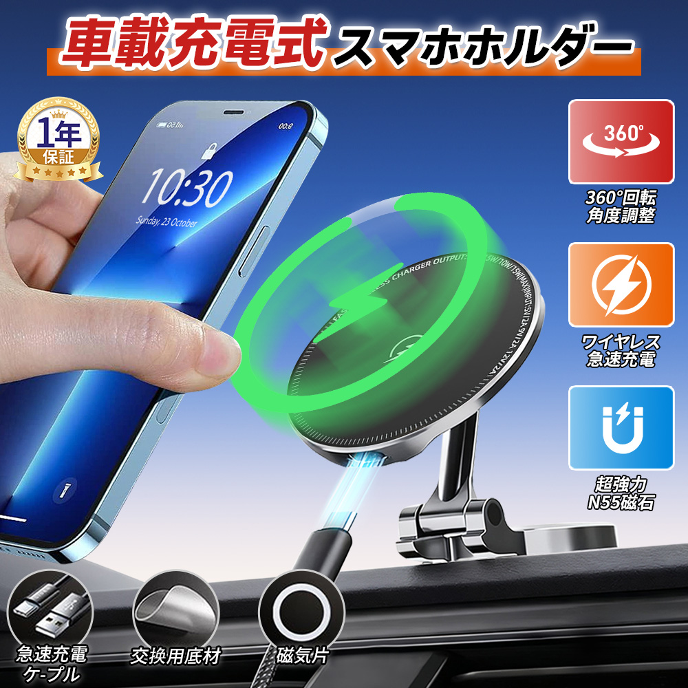【おトク】15w急速充電 車載ホルダー 車載充電器 ワイヤレス充電 スマホホルダー 車 車載 360°回転 両面吸着 マグネット magsafe 全機種対応