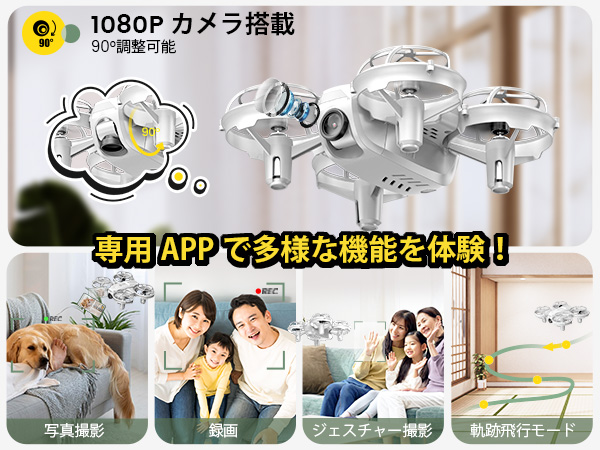 手投げテイクオフモード、高速旋回モード、ホバリングモード、緊急停止、軌跡飛行モード、ジェスチャー撮影、3Dフリップ、ヘッドレスモード、2段階スピード切替、高度維持、写真/動画撮影