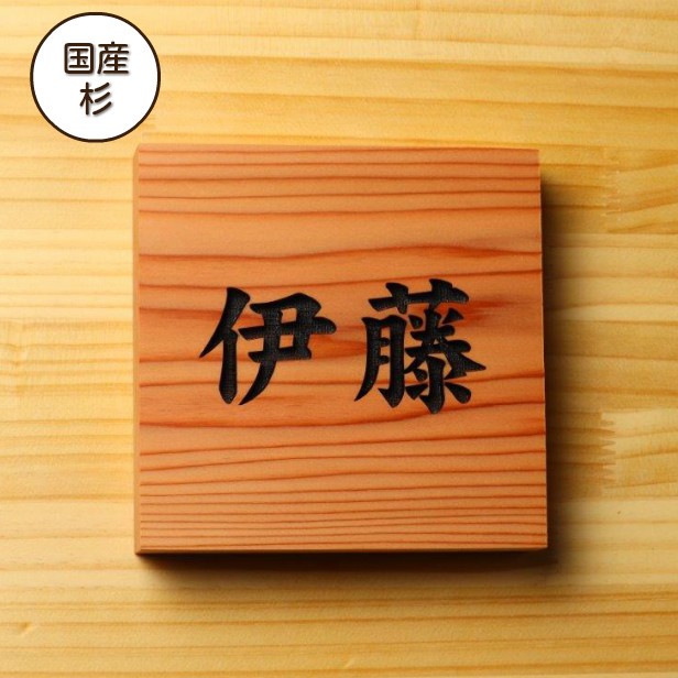木製表札 おしゃれ 正方形 四角 厚い 風水でも良いとされる木の表札 経年変化が楽しめる杉表札 名入れ 凹み浮き彫り 浮彫 レーザー 彫刻 板目 天然木 送料無料