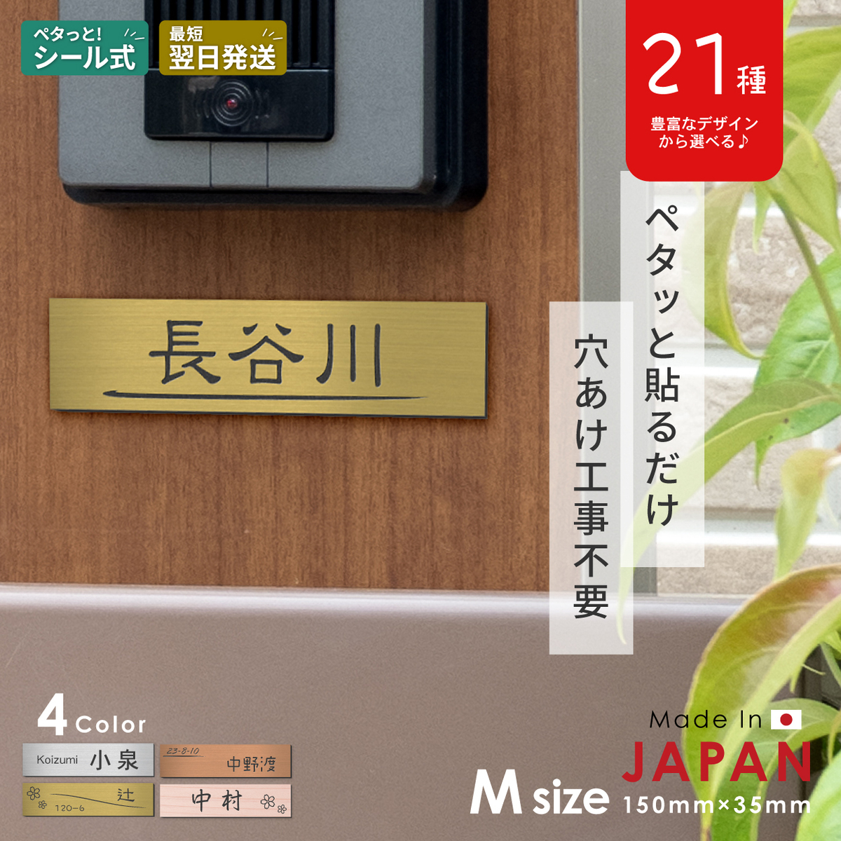 表札 小さい 防水 150×35 M 真鍮風 ゴールド (名入れ無料 1行専用) ポストの名前表示 マンション表札 金 屋外対応 簡単取付シール式 メール便送料無料