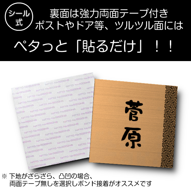 詳細:「現代の名工」松井 美喜夫氏(松井建具店 代表)がデザイン・監修した吉祥文様を用いた開運表札。銅板風/ヘアライン仕上げの2層アクリル板にレーザー彫刻にて刻印しています。文字やデザインは彫り込んでありますので、消えたりすることはありません。裏面には強力な両面テープが標準で加工してあり、ツルツルで平らな面への取り付けであれば、屋外でも大丈夫です。ザラザラ、凸凹面への取り付けはボンド固定がオススメです。取り付ける場所のホコリや汚れなどを綺麗に拭き取った後、貼り付けてください。