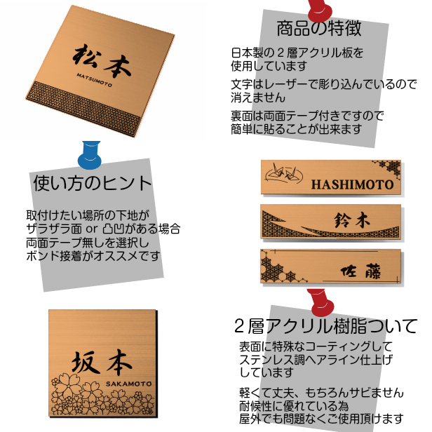 詳細:「現代の名工」松井 美喜夫氏(松井建具店 代表)がデザイン・監修した吉祥文様を用いた開運表札。銅板風/ヘアライン仕上げの2層アクリル板にレーザー彫刻にて刻印しています。文字やデザインは彫り込んでありますので、消えたりすることはありません。裏面には強力な両面テープが標準で加工してあり、ツルツルで平らな面への取り付けであれば、屋外でも大丈夫です。ザラザラ、凸凹面への取り付けはボンド固定がオススメです。取り付ける場所のホコリや汚れなどを綺麗に拭き取った後、貼り付けてください。