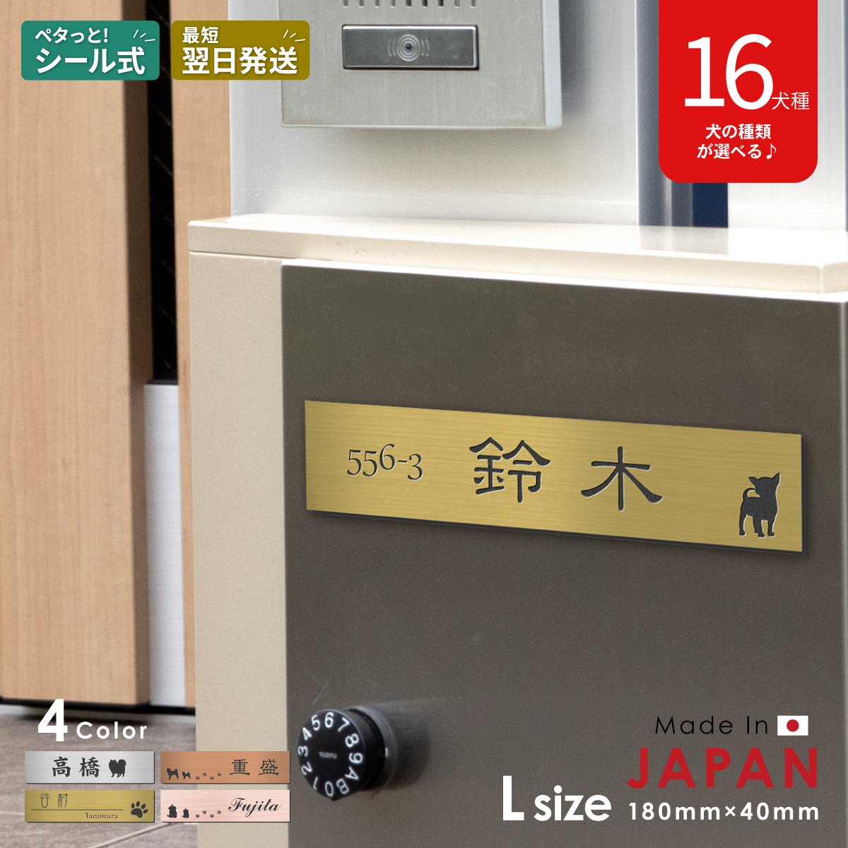 表札 犬 真鍮風 ゴールド 180×40 L トイプードル チワワ ダックス 柴犬 シュナウザー フレンチブルなど いぬの表札 金 屋外対応 シール式 メール便送料無料