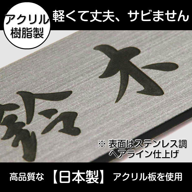 詳細:ステンレス調/ヘアライン仕上げの2層アクリル板にレーザー彫刻にて刻印しています。