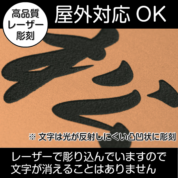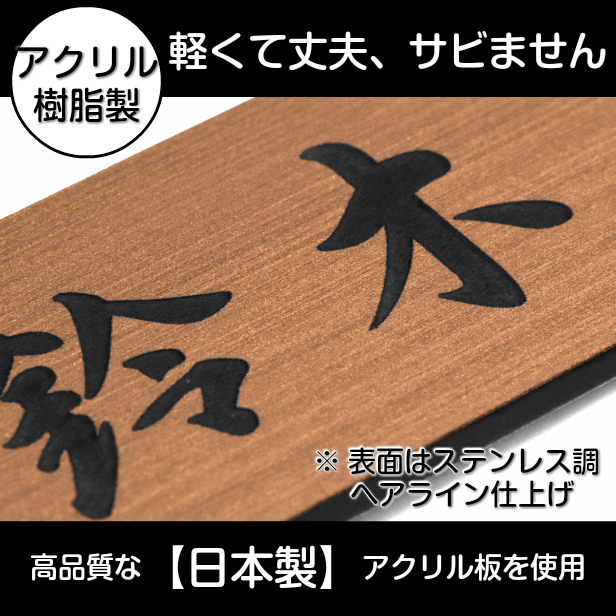詳細:ステンレス調/ヘアライン仕上げの2層アクリル板にレーザー彫刻にて刻印しています。