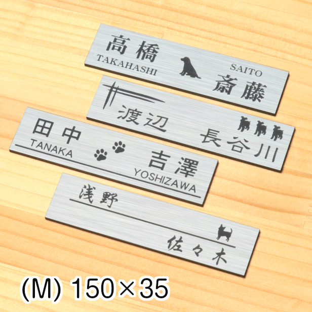 表札 二世帯 犬 いぬ ステンレス調 シルバー 150×35 M 二世帯表札 小さい ひょうさつ 名字 2つ ポスト 門柱 外壁 銀色 屋外対応 シール式 メール便送料無料