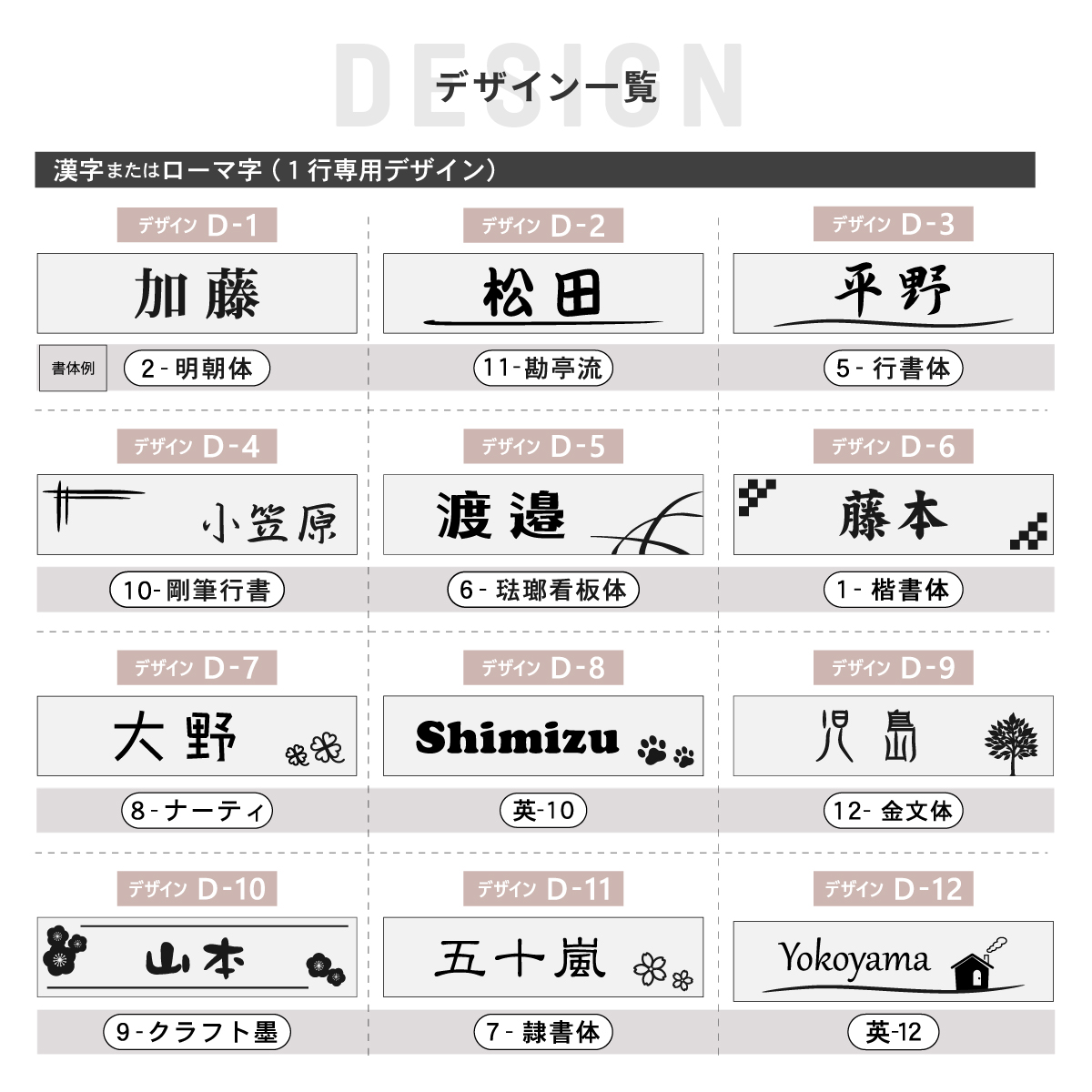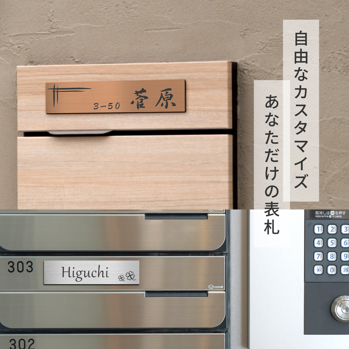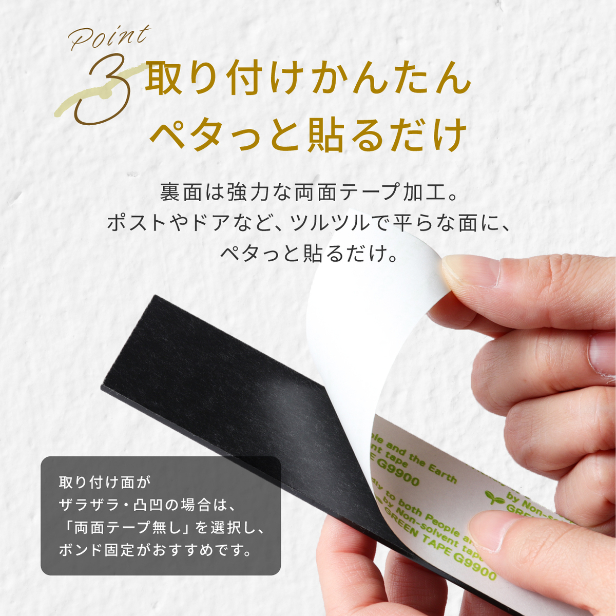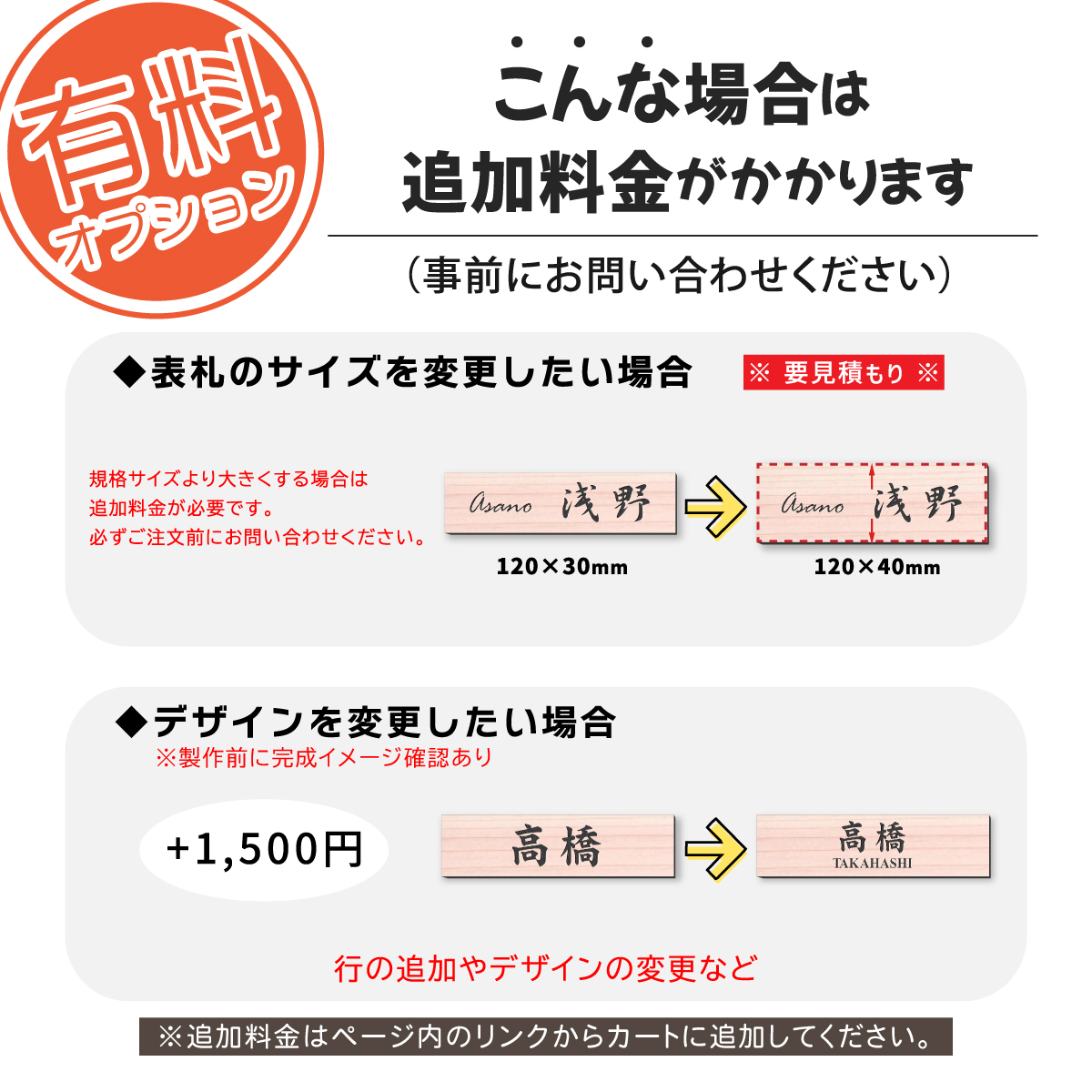 詳細:木目調仕上げの2層アクリル板にレーザー彫刻にて刻印しています。文字は彫り込んでありますので、消えたりすることはありません。裏面には強力な両面テープが標準で加工してあり、ツルツルで平らな面への取り付けであれば、屋外でも大丈夫です。ザラザラ、凸凹面への取り付けはボンド固定がオススメです。