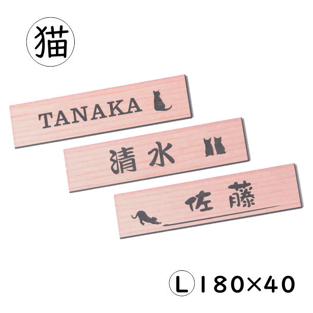 表札 猫 木目調 180×40 L ウッド調 フェイク マンション ポスト 戸建 ねこ ネコ 名前 ネームプレート デザイン 室名札 シール式 プレート ドアプレート ルームプレート おしゃれ ひょうさつ 看板 外壁 門柱 アクリル製 レーザー彫刻 長方形 日本製 メール便送料無料