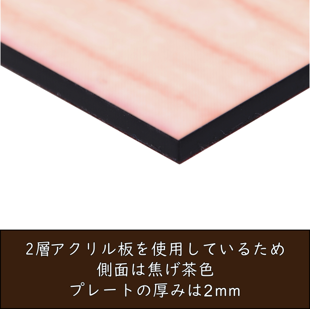 詳細:木目調仕上げの2層アクリル板にレーザー彫刻にて刻印しています。