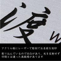 【詳細】ステンレス調/ヘアライン仕上げの2層アクリル板にレーザー彫刻にて刻印しています。