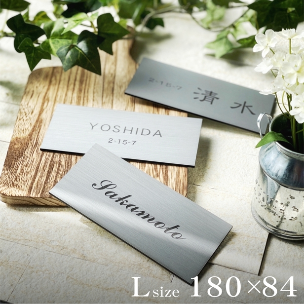 表札 (名字のみ) 180×84 L ステンレス調 シルバー シンプルで美しい計算された余白デザインが際立つモダン表札 オシャレな銀色 屋外対応 メール便送料無料