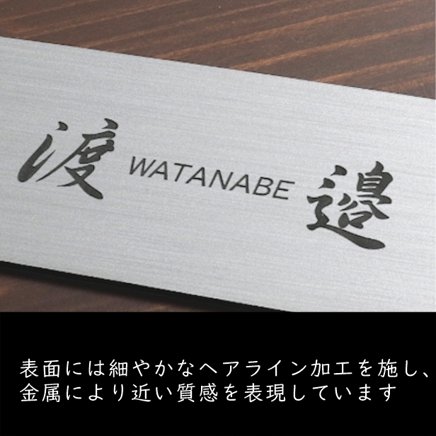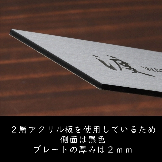 詳細:ステンレス調/ヘアライン仕上げの2層アクリル板にレーザー彫刻にて刻印しています。
