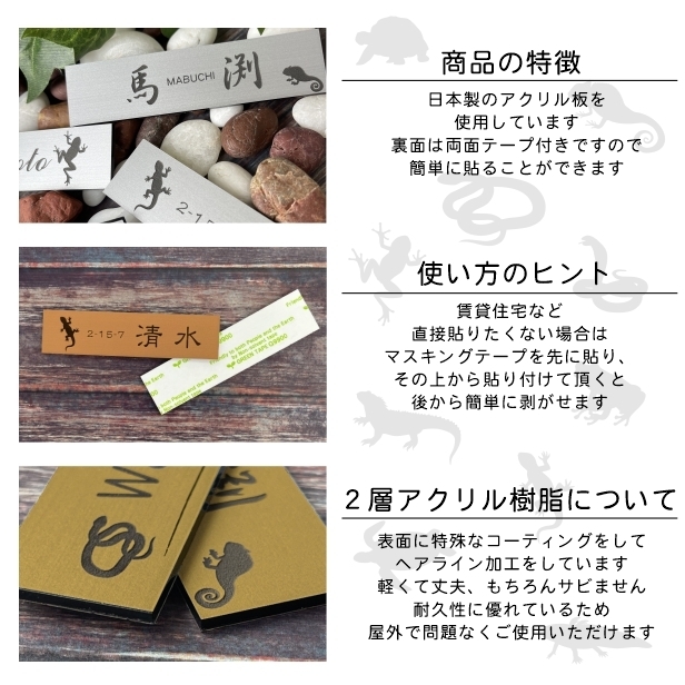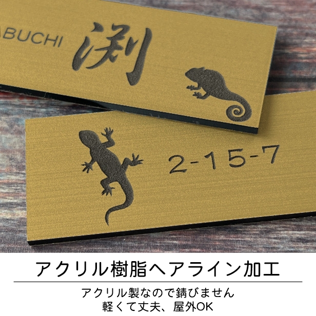 表札 ネームプレート 爬虫類・両生類 真鍮風 ゴールド 120×30 S カエルやヘビ、トカゲ(ヤモリ)やイグアナ、亀やカメレオン、イグアナやウーパールーパーのシルエットがユニーク。戸建、マンションの表札として門柱やポストに。シール式で取付け簡単。金 アクリル製 屋外対応