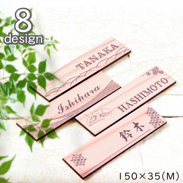 表札 和風 和柄 おしゃれなデザイン表札 木目調 フェイク ウッド調 150×35 M 伝統的な吉祥文様を刻印した縁起の良い表札 風水 マンション ポスト ドア 外壁 門柱 組子柄 長方形 アクリル製 文字が消えないレーザー彫刻 屋外対応 貼るだけ シール式 メール便送料無料