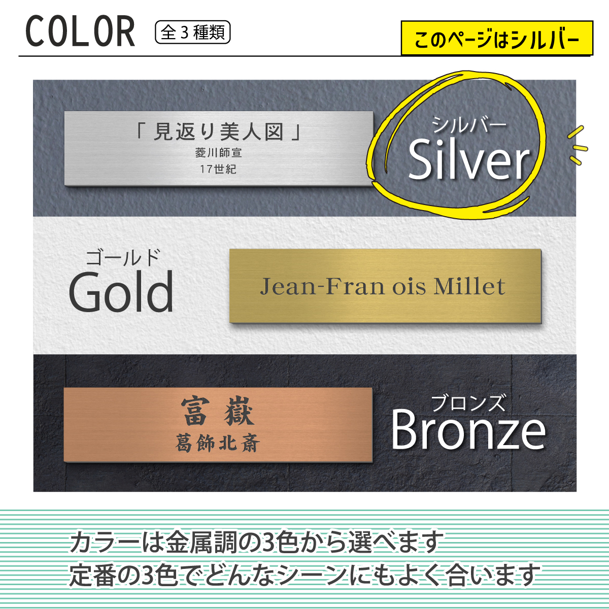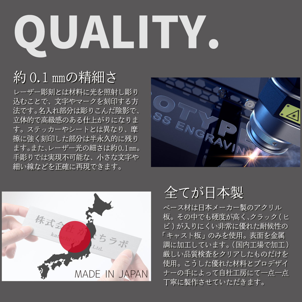 【材質】 2層アクリル板(日本製)+両面テープ 【サイズ】 <スタンダード> 7.5cm×1.8cm×厚さ2mm <ワイド> 7.5cm×2.5cm×厚さ2mm 【入り数】 1個 【製造国】 日本(材料から製造まで全てMADE IN JAPAN) 【備考】 ステンレス調/ヘアライン仕上げの 2層アクリル板にレーザー彫刻にて 刻印しています 文字やデザインはレーザーで 彫り込んでありますので、消えません 裏面には強力な両面テープが標準で加工してあり、 ツルツルで平らな面への取り付けであれば、 屋外でもOK! ザラザラ、凸凹面への取り付けは 接着剤との併用が安心です |