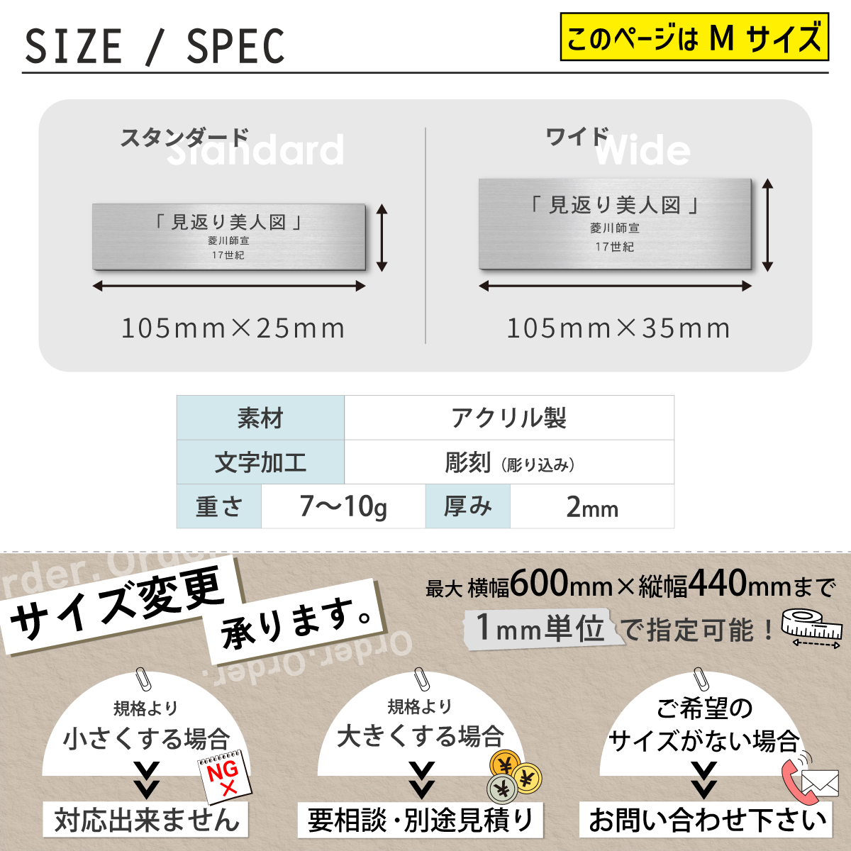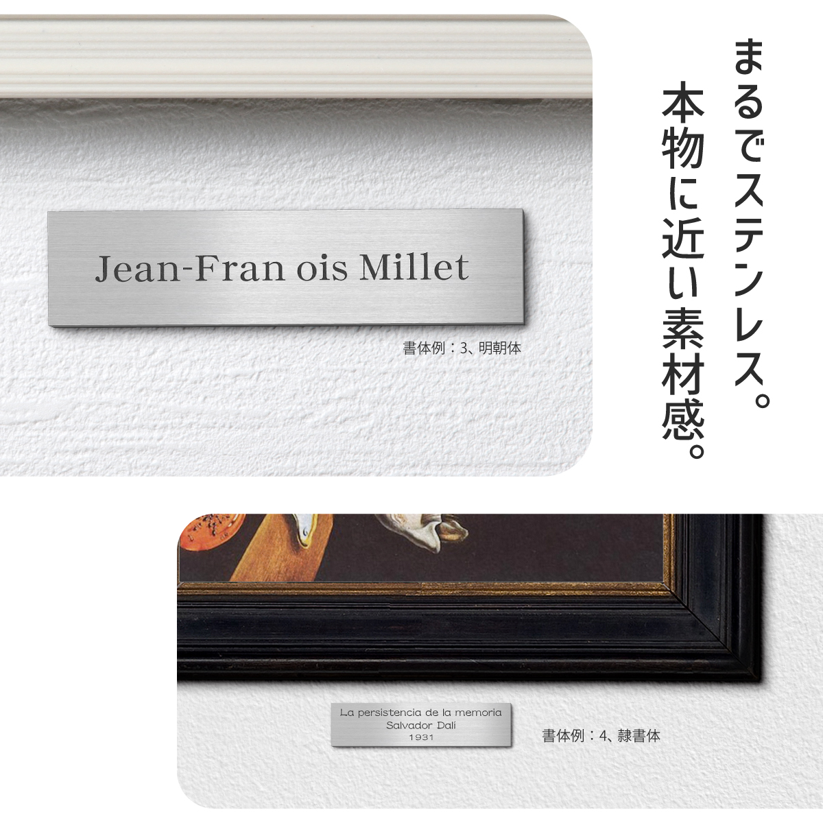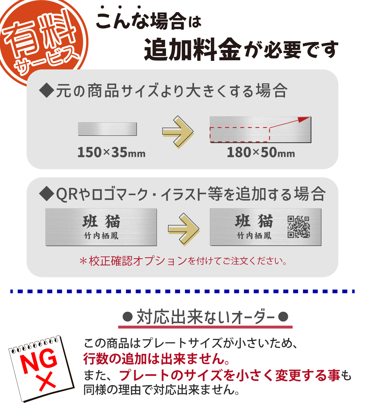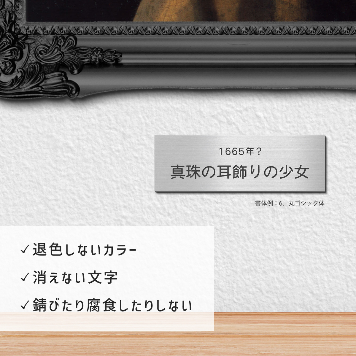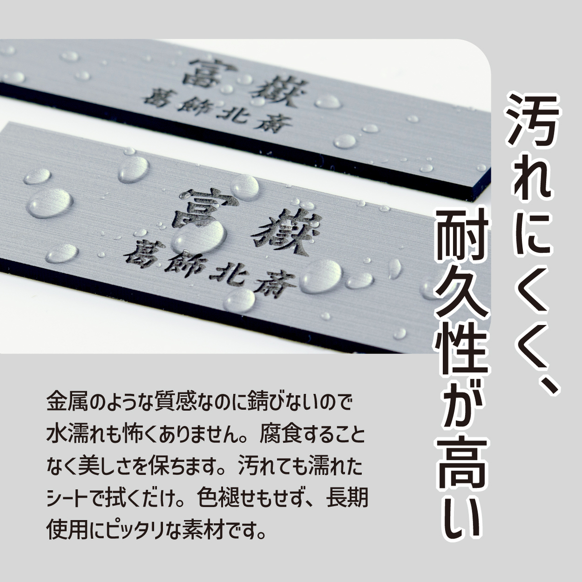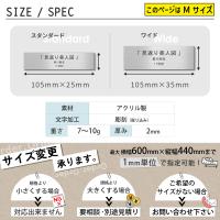 【材質】 2層アクリル板(日本製)+両面テープ 【サイズ】 <スタンダード> 10.5cm×2.5cm×厚さ2mm <ワイド> 10.5cm×3.5cm×厚さ2mm 【入り数】 1個 【製造国】 日本(材料から製造まで全てMADE IN JAPAN) 【備考】 ステンレス調/ヘアライン仕上げの 2層アクリル板にレーザー彫刻にて 刻印しています 文字やデザインはレーザーで 彫り込んでありますので、消えません 裏面には強力な両面テープが標準で加工してあり、 ツルツルで平らな面への取り付けであれば、 屋外でもOK! ザラザラ、凸凹面への取り付けは 接着剤との併用が安心です |