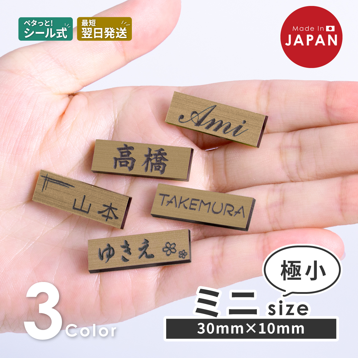 ミニ表札 真鍮風 30mm×10mm ゴールド 戸建やマンションに目立たせたくない小さな表札 かわいいサイズでインターホンカバーやミニチュアハウス、小物キャビネットなど、刻印内容は自由 色々な用途で使えます。 アクリル製で錆びずにいつまでも綺麗なまま日本製 金